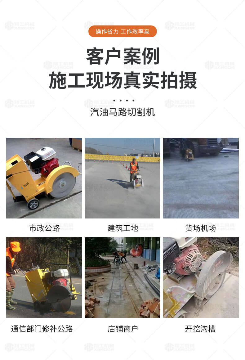 用于公路、市政、建筑、煤氣、通信部門修補(bǔ)公路或開挖溝槽時(shí)進(jìn)行路面切割。相對(duì)于電動(dòng)或柴油動(dòng)力的路面切割機(jī),操作輕巧省力,運(yùn)輸方便,工作效率高。