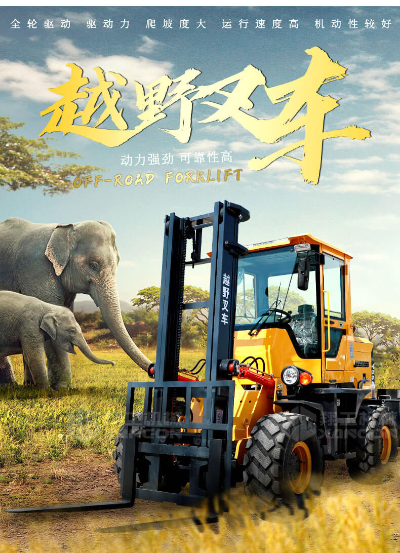 5.越野叉車發(fā)動機功率大,采用全輪驅動和越野輪胎。